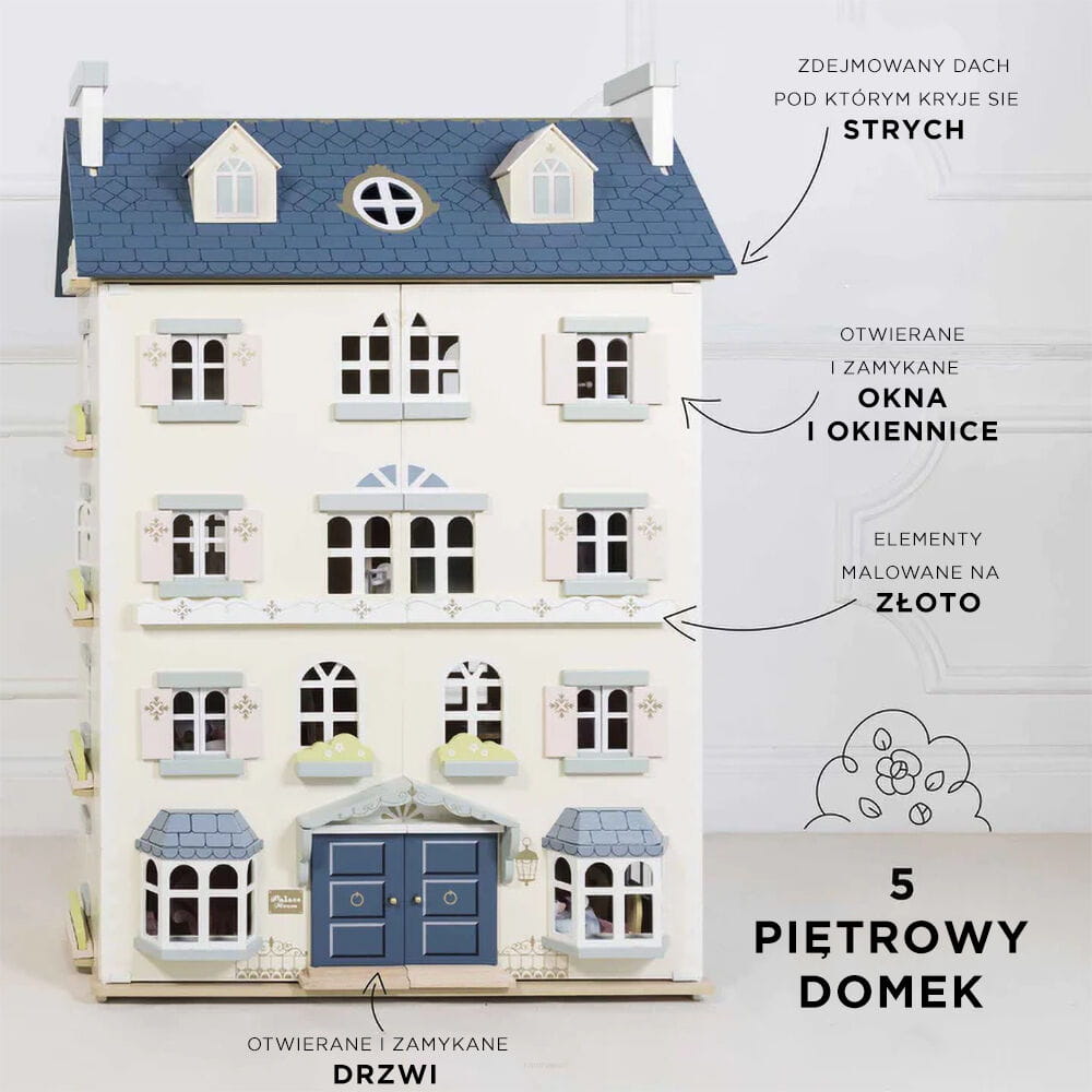 Palace House to najbardziej okazały domek dla lalek w kolekcji Le Toy Van. Ma pięć kondygnacji, 8 przestronnych pokoi i mnóstwo detali, które robią klimat: różne style okien, osobne tapety w każdym pomieszczeniu, piękne klatki schodowe i królewskie podwójne drzwi.