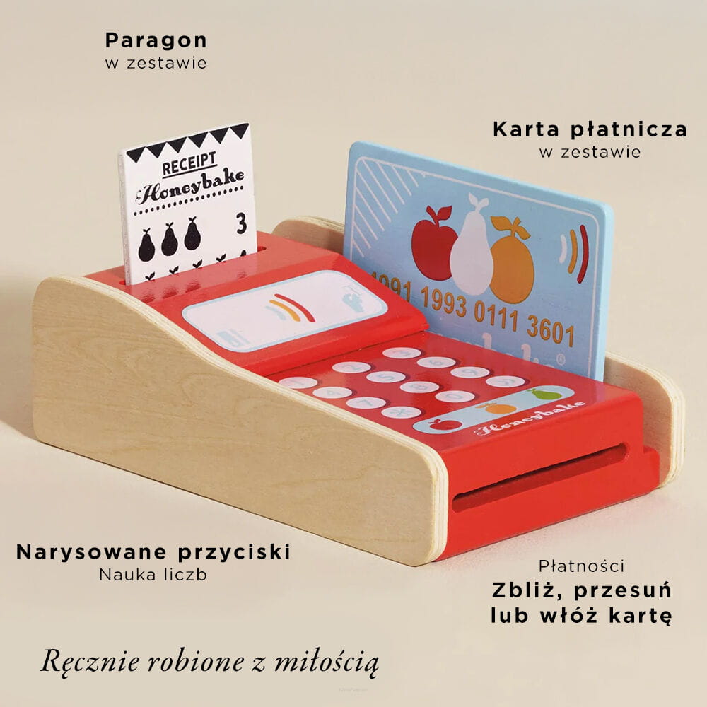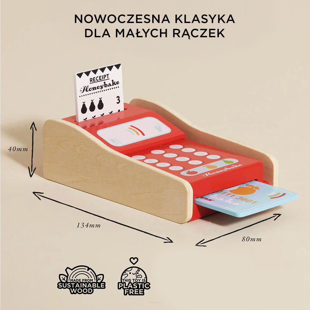 Chodźmy na zakupy! Urocza drewniana zabawka w postaci terminala do kart płatniczych to doskonały sposób na naukę liczenia dla dzieci podczas zabawy w sklep. Drewniany terminal został pięknie pomalowany na czerwono i wraz z nim w zestawie znajduje się paragon i karta płatnicza. Ta solidna zabawka edukacyjna jest częścią wielokrotnie nagradzanej kolekcji Honeybake marki Le Toy Van. Terminal do kart nie tylko prezentuje się świetnie, ale też stanowi doskonały sposób na naukę matematyki podczas kreatywnego odgrywania ról.