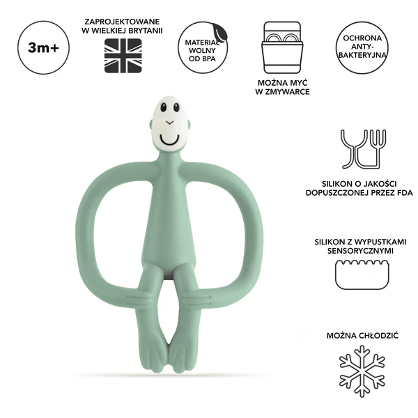 Miętowa małpka Matchstick Monkey to gryzak, który dziecko łatwo chwyta za „łapki”, a wypustki na główce delikatnie masują dziąsła. To także wygodny sposób na nałożenie żelu na ząbkowanie – bez palców i bez podgryzania.
