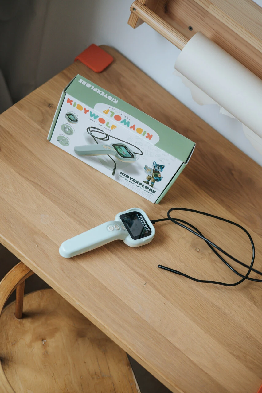 Kidywolf KidyExplore to elastyczna kamera stworzona dla dzieci, które lubią odkrywać, sprawdzać i zaglądać tam, gdzie zwykle trudno coś zobaczyć. Dzięki kamerze umieszczonej na końcu metrowego przewodu dziecko może obserwować zakamarki w domu, liście, owady, miejsca pod meblami czy elementy natury podczas spaceru.