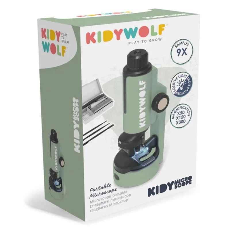 Kidywolf KIDYMICROSCOPE to przenosny mikroskop w kolorze zielonym z 3 poziomami powiekszenia (50×, 150×, 300×) oraz oswietleniem bezposrednim i przechodzacym. Zasilany 2 bateriami AA (brak w zestawie). Polecany dla dzieci od ok. 8 lat.