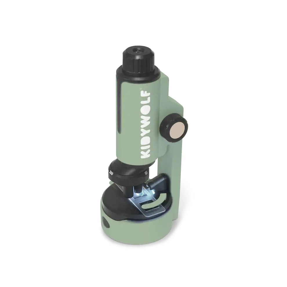 KIDYMICROSCOPE to kompaktowy mikroskop edukacyjny Kidywolf w zielonej wersji kolorystycznej. Ma trzy poziomy powiekszenia (50×, 150×, 300×) oraz dwa tryby oswietlenia: bezposredni i przechodzacy (do obserwacji preparatow).