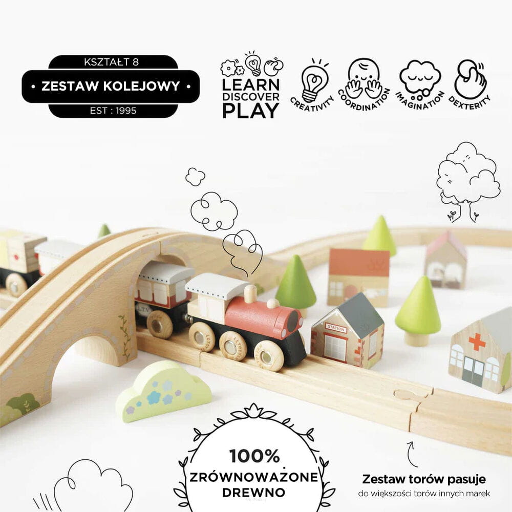 Wspaniały drewniany zestaw kolejowy w kształcie cyfry 8 zawiera 17 odcinków torów kolejowych (prostych, krętych i most), pociąg złożony z 4 wagoników, które łączą się na magnesy oraz 19 elementów zabudowy (stacja, sklep, szpital, farma, domki, namioty, drzewa i krzewy). Łącznie 40 elementów, które zostały starannie i bardzo szczegółowo ozdobione dla większego realizmu zabawy i frajdy Twojego dziecka z jazdy tą kolejką. Zabawka nie zawiera plastiku i stanowi doskonały prezent dla każdego, kto uwielbia bawić się pociągami.