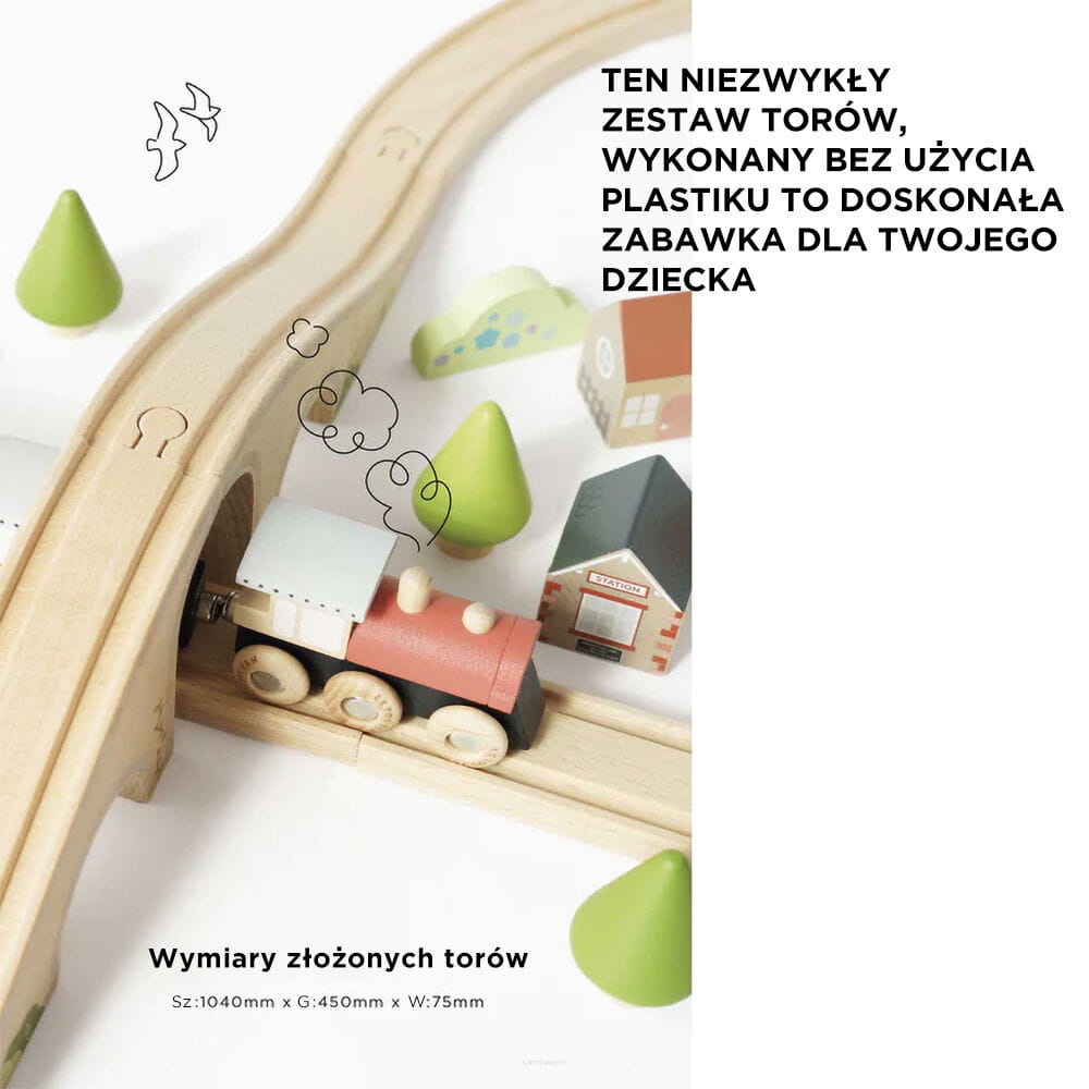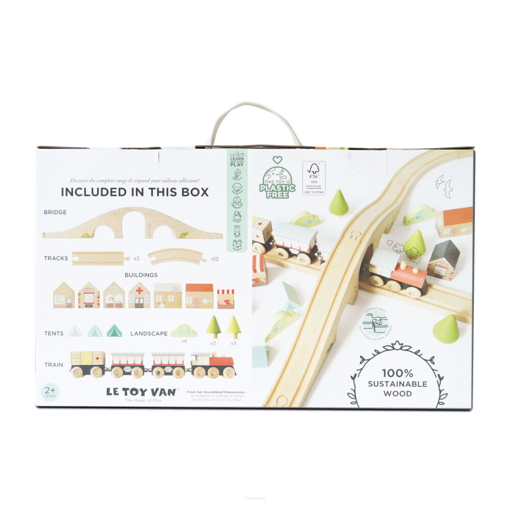 Z taką kolejką w kształcie ósemki z pięknym mostem i małym miasteczkiem z pewnością nie ma nudy! Zestaw zawiera aż 40 elementów: 17 odcinków torów kolejowych (prostych, krętych i most), pociąg złożony z 4 wagoników, które łączą się na magnesy oraz 19 elementów zabudowy (stacja, sklep, szpital, farma, domki, namioty, drzewa i krzewy). Każdy detal został starannie i bardzo szczegółowo odwzorowany dla większego realizmu zabawy i frajdy Twojego dziecka z jazdy tą kolejką. Ta solidna zabawka, wykonana ze zrównoważonego drewna certyfikowanego przez FSC™, pomalowana przy użyciu nietoksycznych farb na bazie wody, nie zawiera plastiku i stanowi wspaniały, przemyślany prezent dla wyjątkowego malucha.