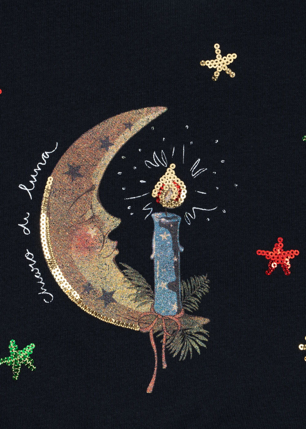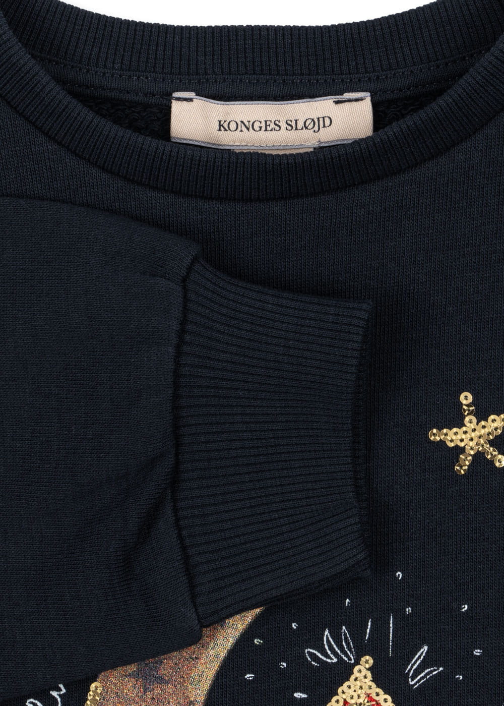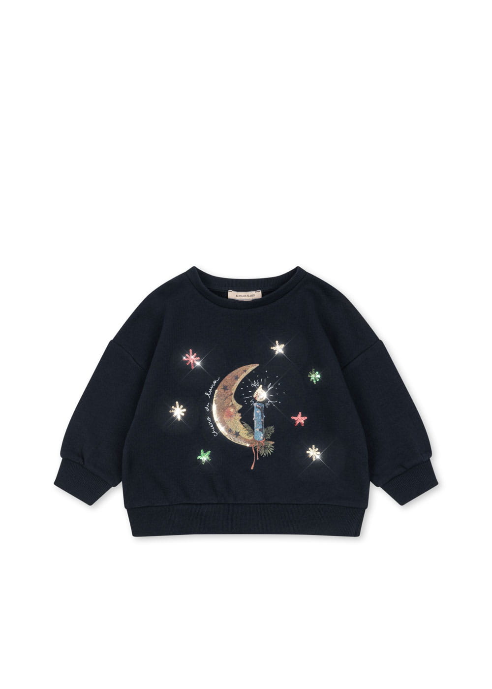 Bluza dziecięca LOUPY LOU SWEAT SHIRT OCS marki Konges Slojd w kolorze DARK NAVY z motywem księżyca i wisienek. Uszyta w 100% z certyfikowanej bawełny organicznej OCS – miękka, ciepła i idealna na chłodniejsze dni.