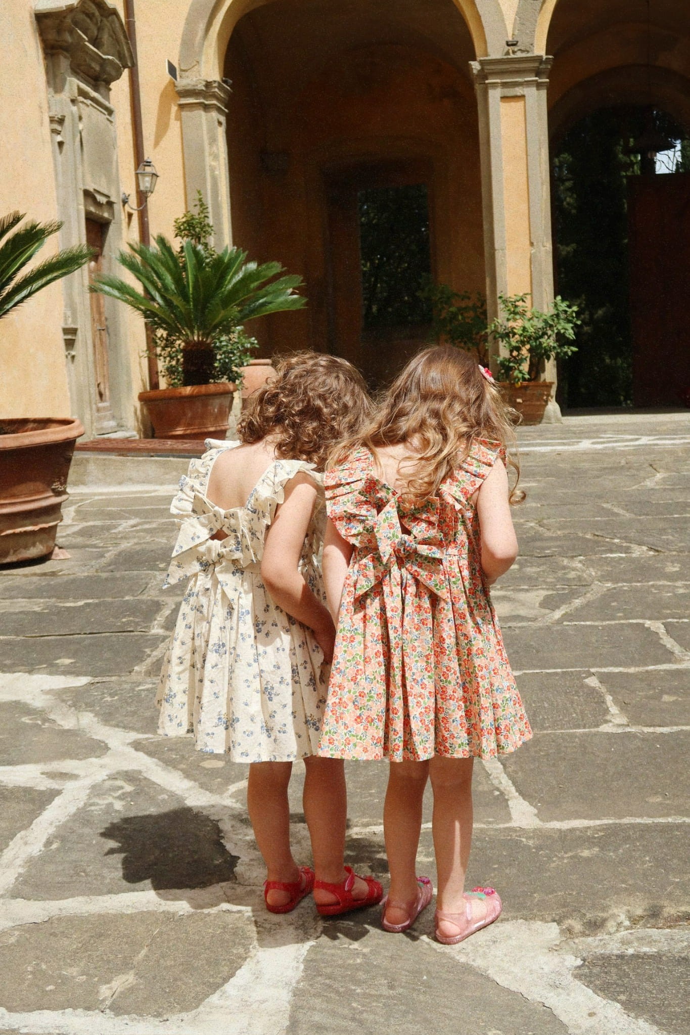 Konges Sløjd Cianna to lekka sukienka dziecięca w kolorze Tramonto, idealna na lato, rodzinne uroczystości i codzienne noszenie. Model wyróżnia się delikatnym kwiatowym wzorem, dekoracyjnymi falbankami przy rękawach oraz uroczą kokardą z tyłu.