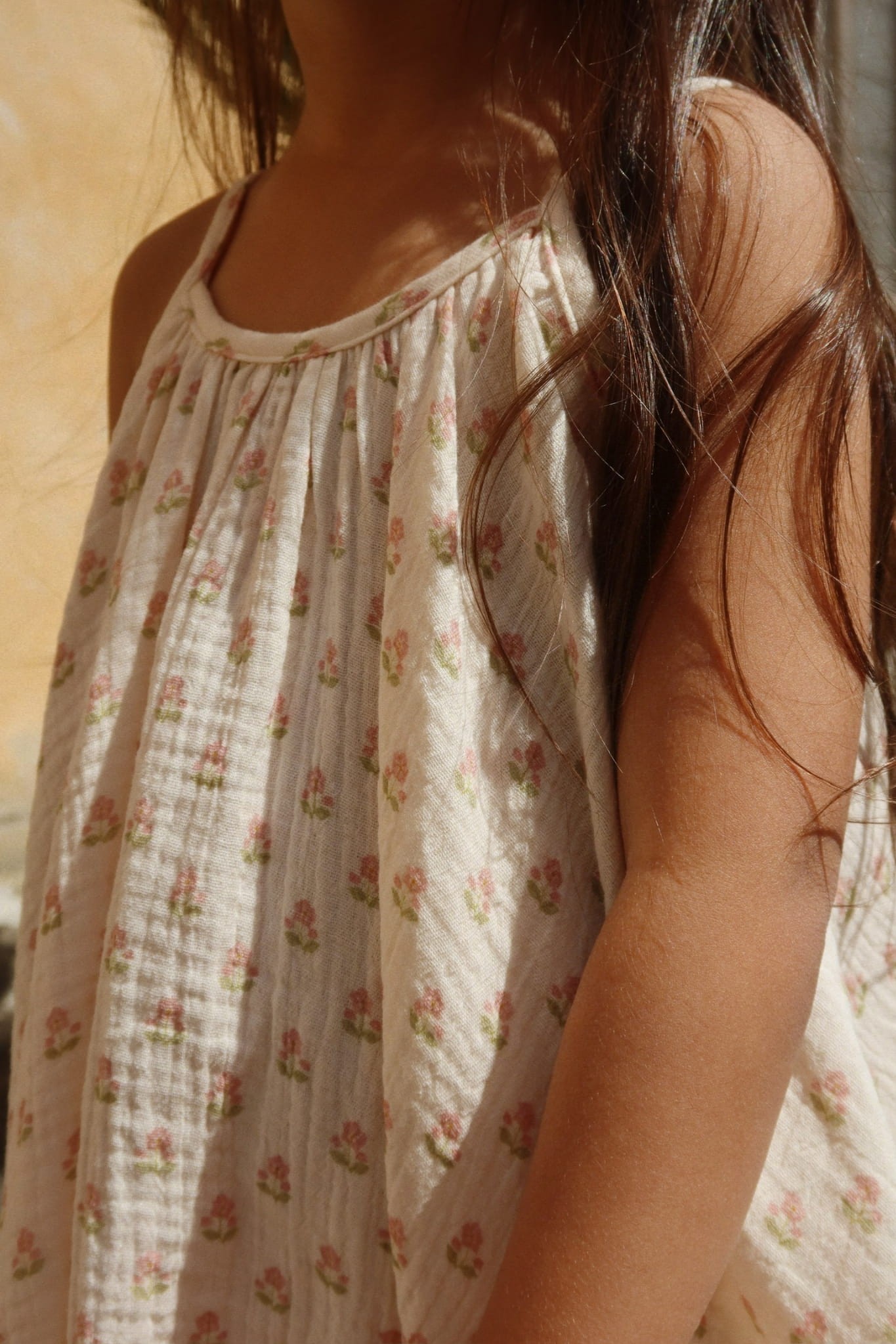 Konges Sløjd Coco Strap to lekka sukienka dziecięca w kolorze Carta Rosa, idealna na ciepłe dni, wakacyjne wyjazdy i letnie uroczystości. Model ma delikatne ramiączka, swobodny fason i subtelny kwiatowy wzór, który nadaje całości dziewczęcy, premium charakter.