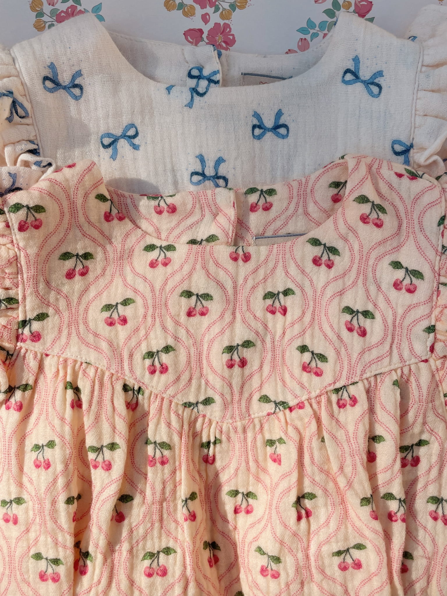Romper ma prosty, komfortowy fason, który nie krępuje ruchów dziecka. Zapięcie na napy w kroku ułatwia przewijanie, a praktyczne zapięcie przy dekolcie pozwala szybko ubrać malucha. Falbanki na ramionach i subtelny wzór w kokardki dodają całości uroczego charakteru.