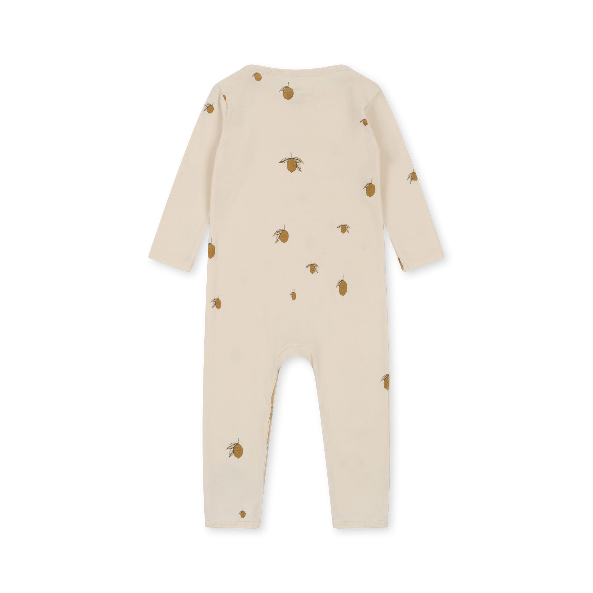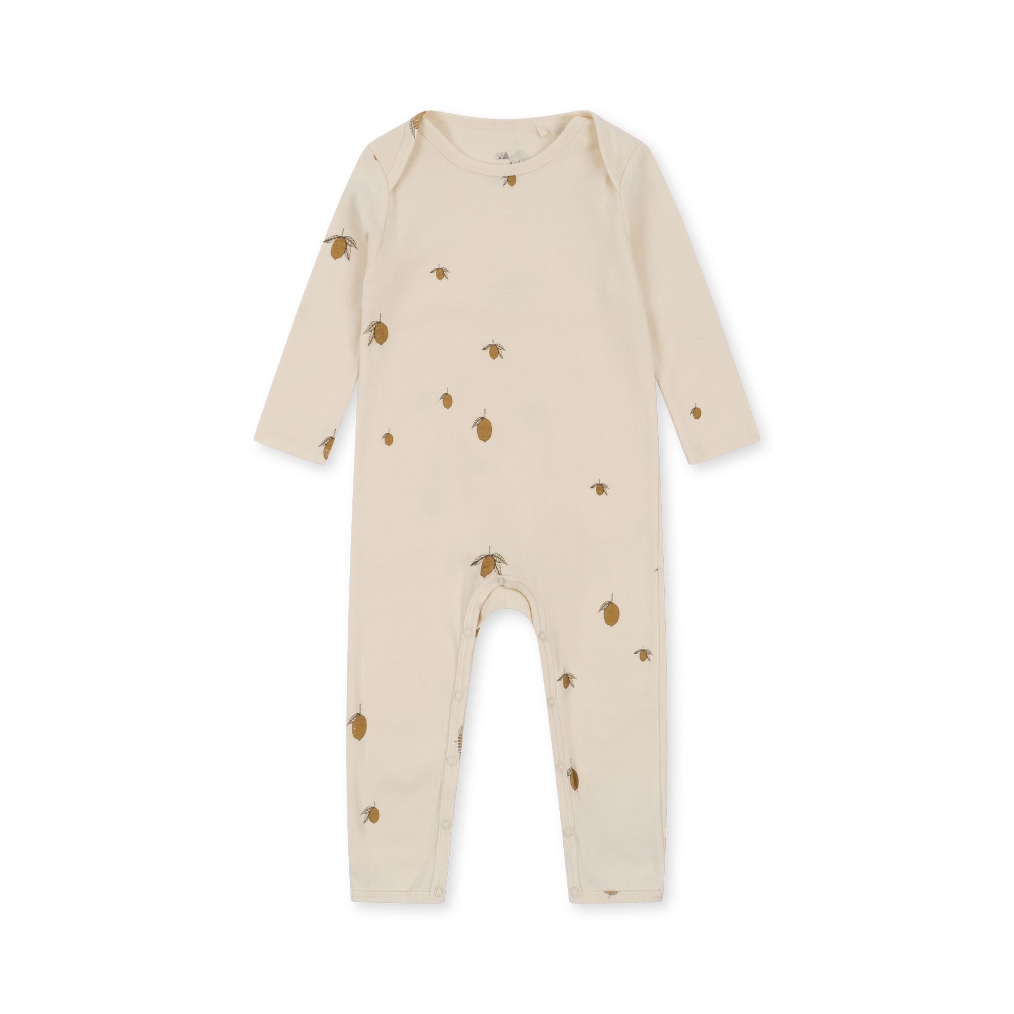 ONESIE GOTS to miękki, jednoczęściowy rampers z długim rękawem marki Konges Slojd, wykonany w 100% z organicznej bawełny z certyfikatem GOTS (CU1094701). Pastelowy odcień Lemon z delikatnym, owocowym nadrukiem sprawia, że to ubranko jest nie tylko wygodne, ale też wyjątkowo estetyczne.