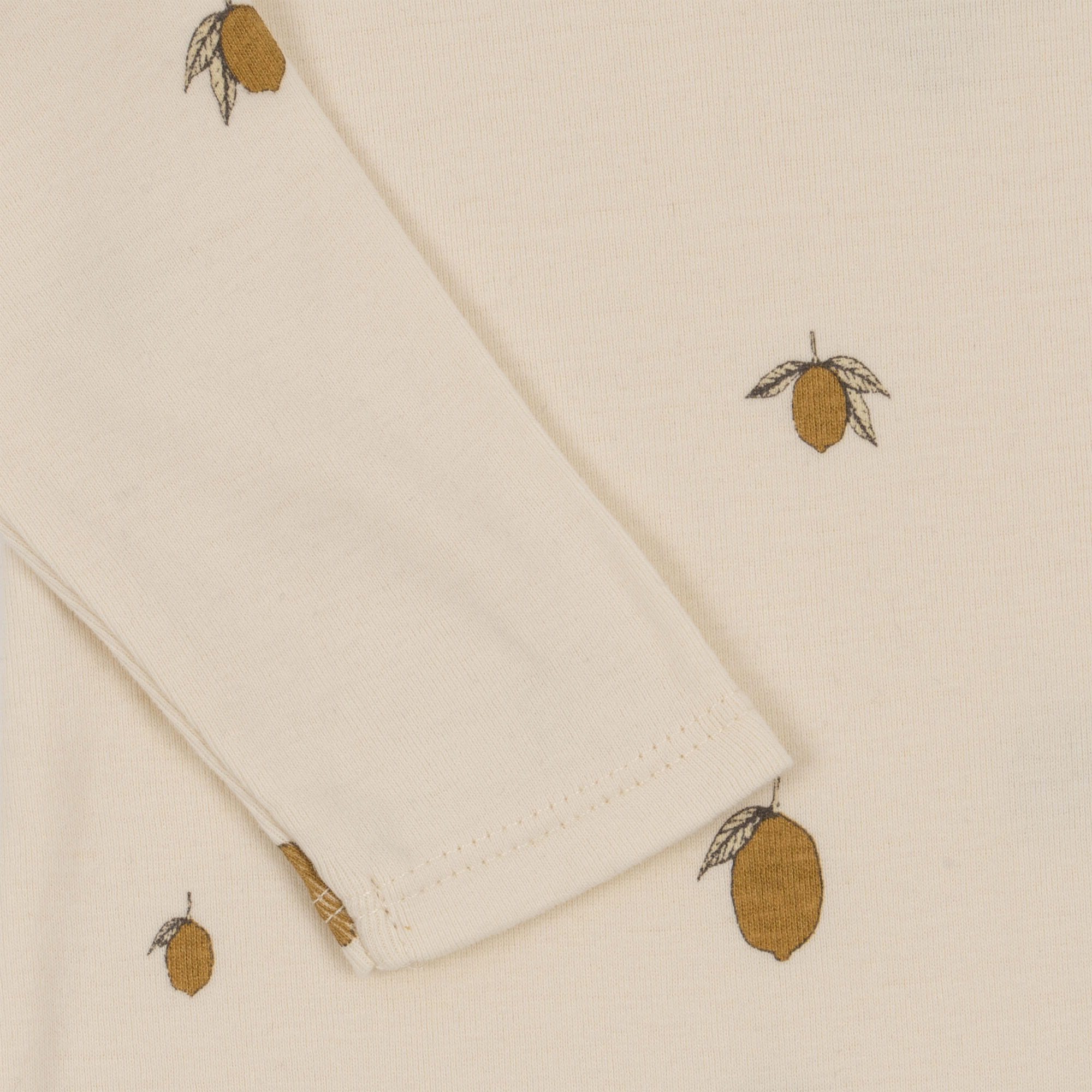 Kolor Lemon z nadrukiem owoców należy do klasycznych motywów marki Konges Slojd. Print jest subtelny i łatwo łączy się z innymi elementami garderoby dziecka – body, czapką czy kocykiem w podobnej kolorystyce.
