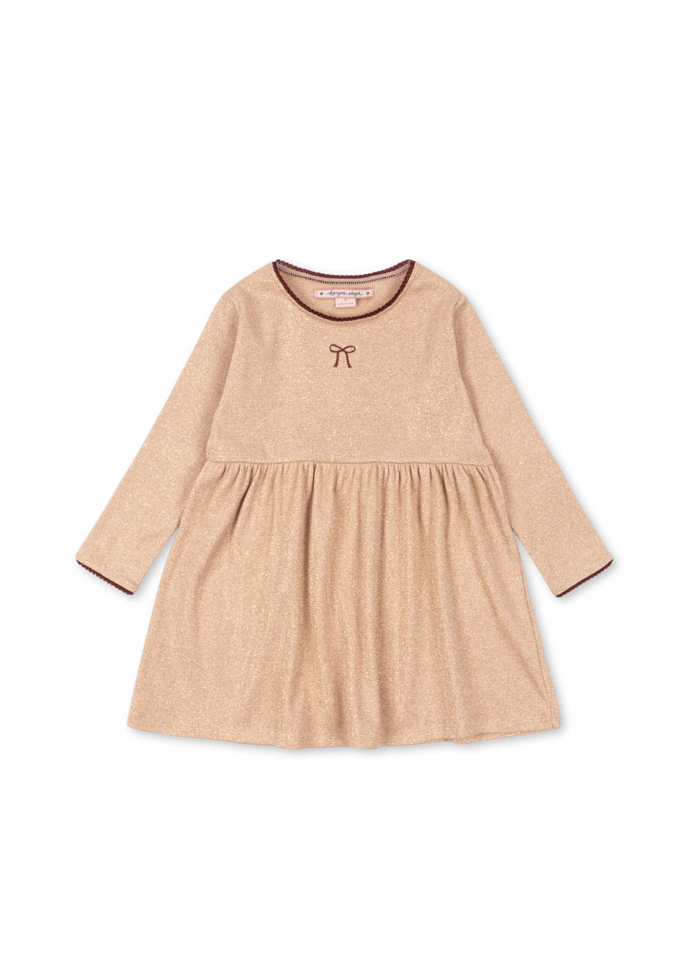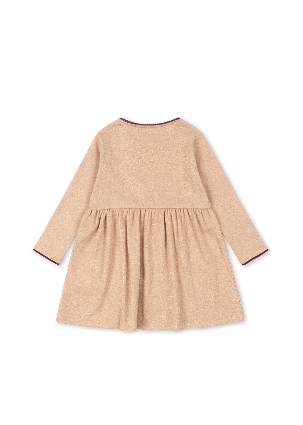 Sukienka Roli to klasyczny model marki Konges Slojd, który łączy wygodę dzianiny z delikatnym błyskiem. Kolor Moonlight (jasny, pudrowy beż) sprawia, że sukienka jest niezwykle uniwersalna – pasuje zarówno na co dzień, jak i na wyjątkowe okazje.