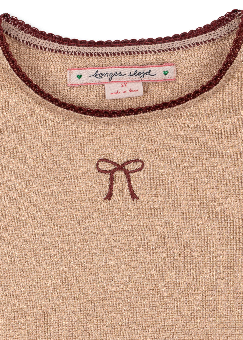 - Skład: 60% bawełna, 38% lurex, 2% elastan – przyjemny w dotyku materiał z elastycznym wykończeniem.