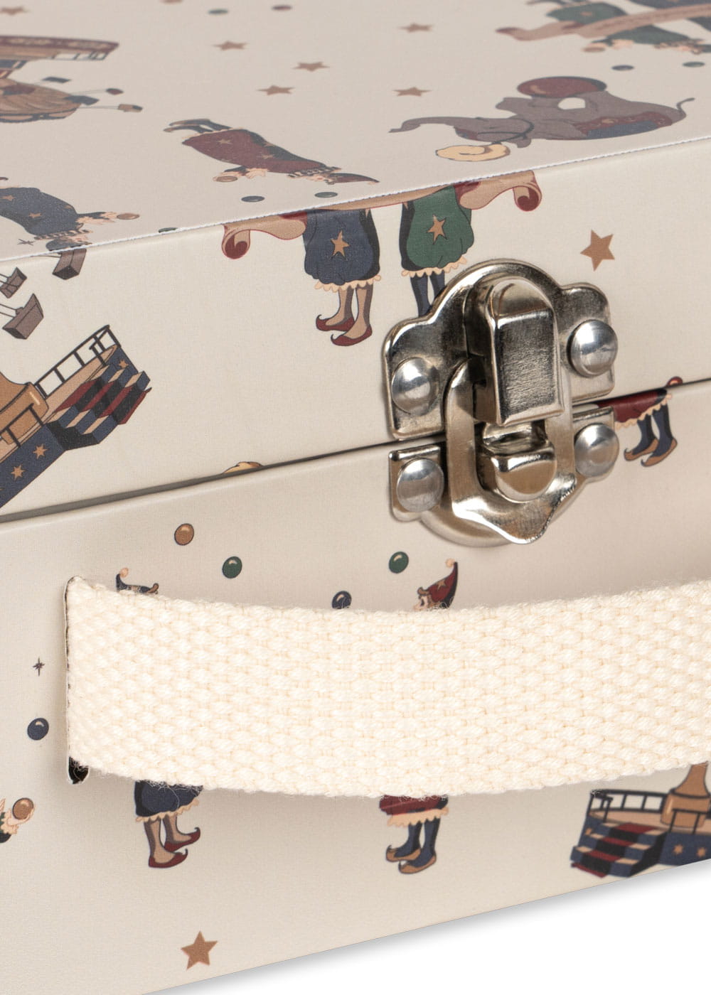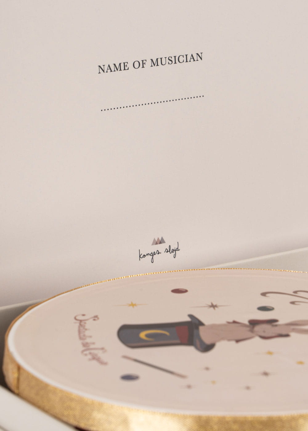 Walizka i instrumenty zdobią ilustracje w klimacie cyrkowym – delikatne, pastelowe kolory i charakterystyczny styl Konges Slojd. Zestaw będzie pięknie wyglądał w dziecięcym pokoju i idealnie wpisze się w estetykę Niunio Concept.