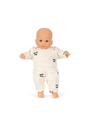Lalka ma delikatną, przyjazną buzię i miękkie ciało pokryte tkaniną z czereśniowym nadrukiem Cherry AOP. Ubrana jest w bawełniany, dwuczęściowy komplet – top i spodnie – który nadaje jej klasyczny, spokojny charakter. To zabawka, która świetnie wspiera rozwój empatii, odgrywanie ról i pierwsze zabawy „w mamę i tatę”.