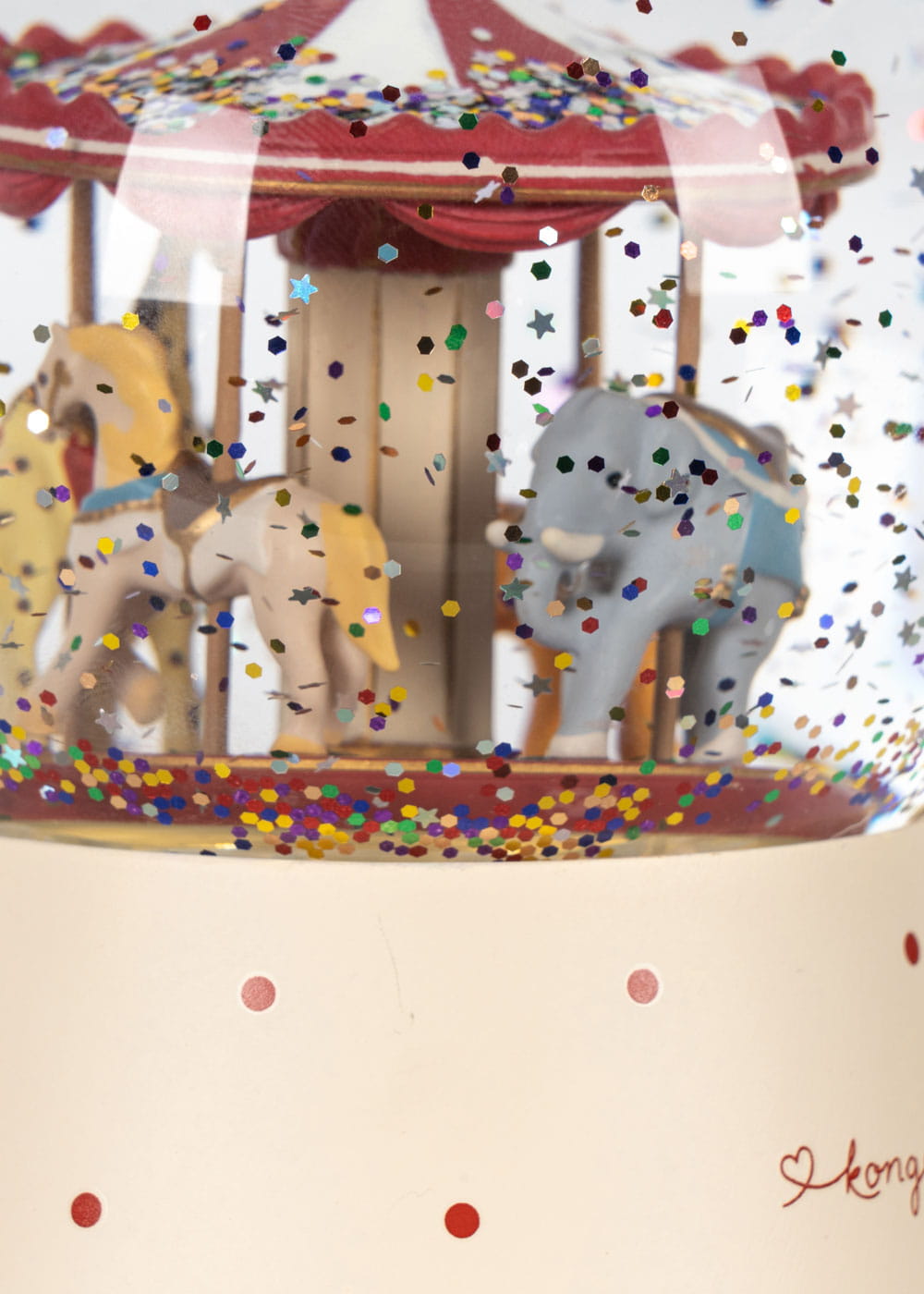 Sparkling Glow Ball marki Konges Sløjd to wyjątkowa, kolekcjonerska kula dekoracyjna z podświetleniem, która tworzy ciepły, spokojny klimat w pokoju dziecka. W środku znajduje się miniaturowa karuzela otoczona błyszczącym brokatem. Po poruszeniu kuli drobinki brokatu unoszą się i wirują, dając efekt migoczącej poświaty.