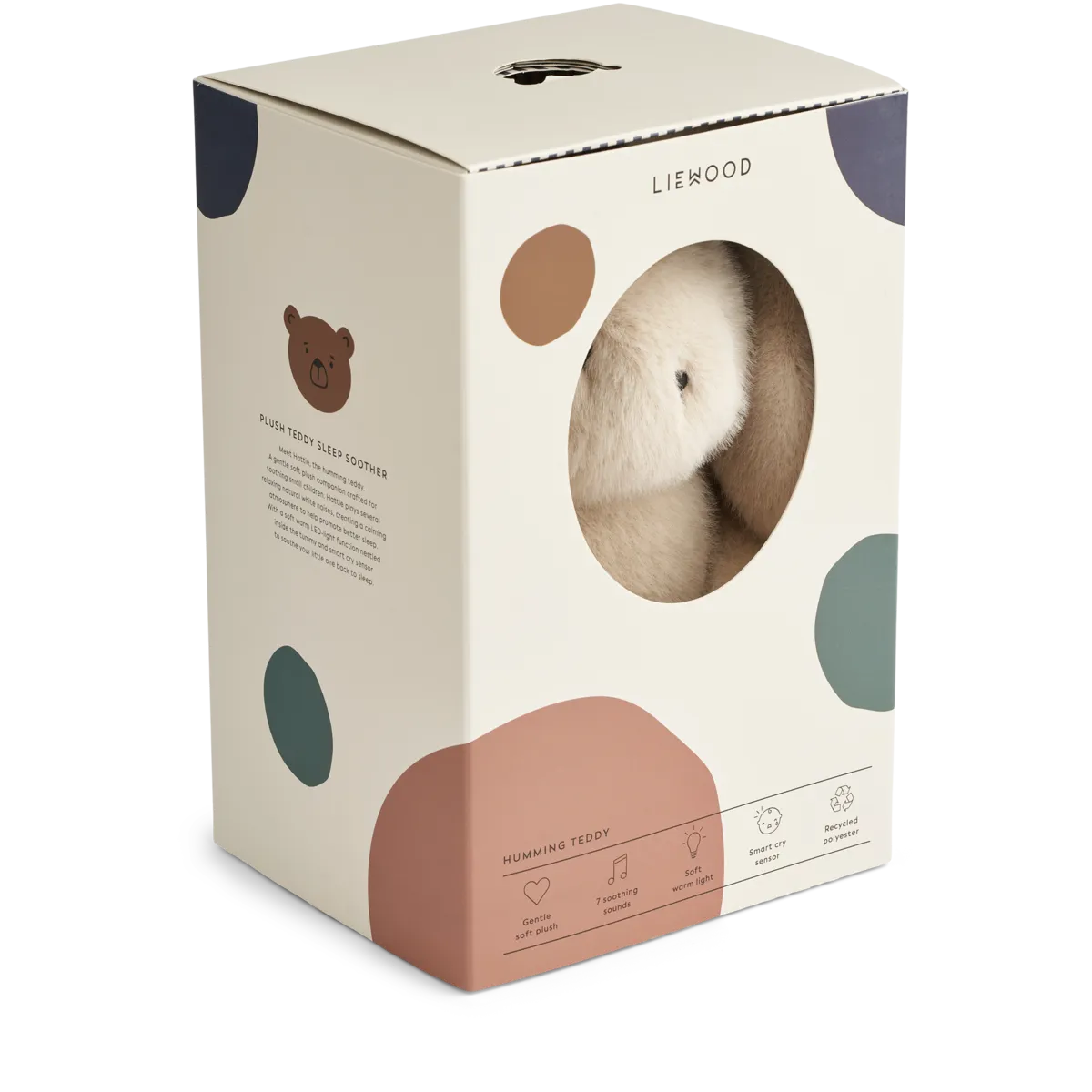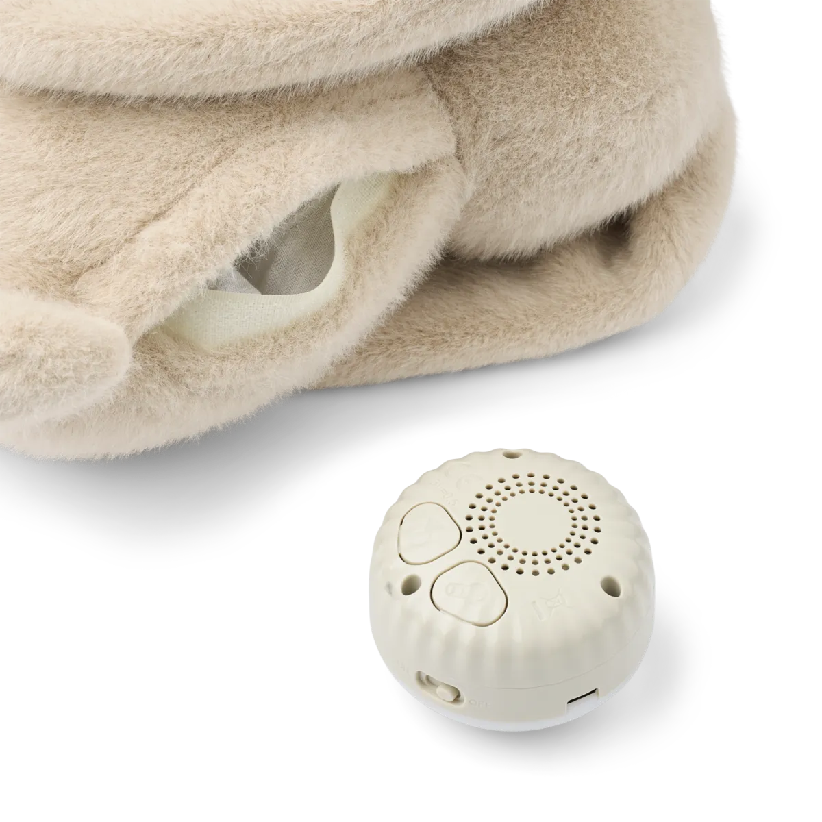 Hattie Rabbit Humming Teddy to pluszowy króliczek, który łączy funkcję szumiącej przytulanki i delikatnej lampki nocnej. W brzuszku ukryte jest ciepłe światło LED oraz moduł dźwiękowy z ośmioma uspokajającymi odgłosami, które pomagają maluszkowi wyciszyć się i spokojnie zasnąć.