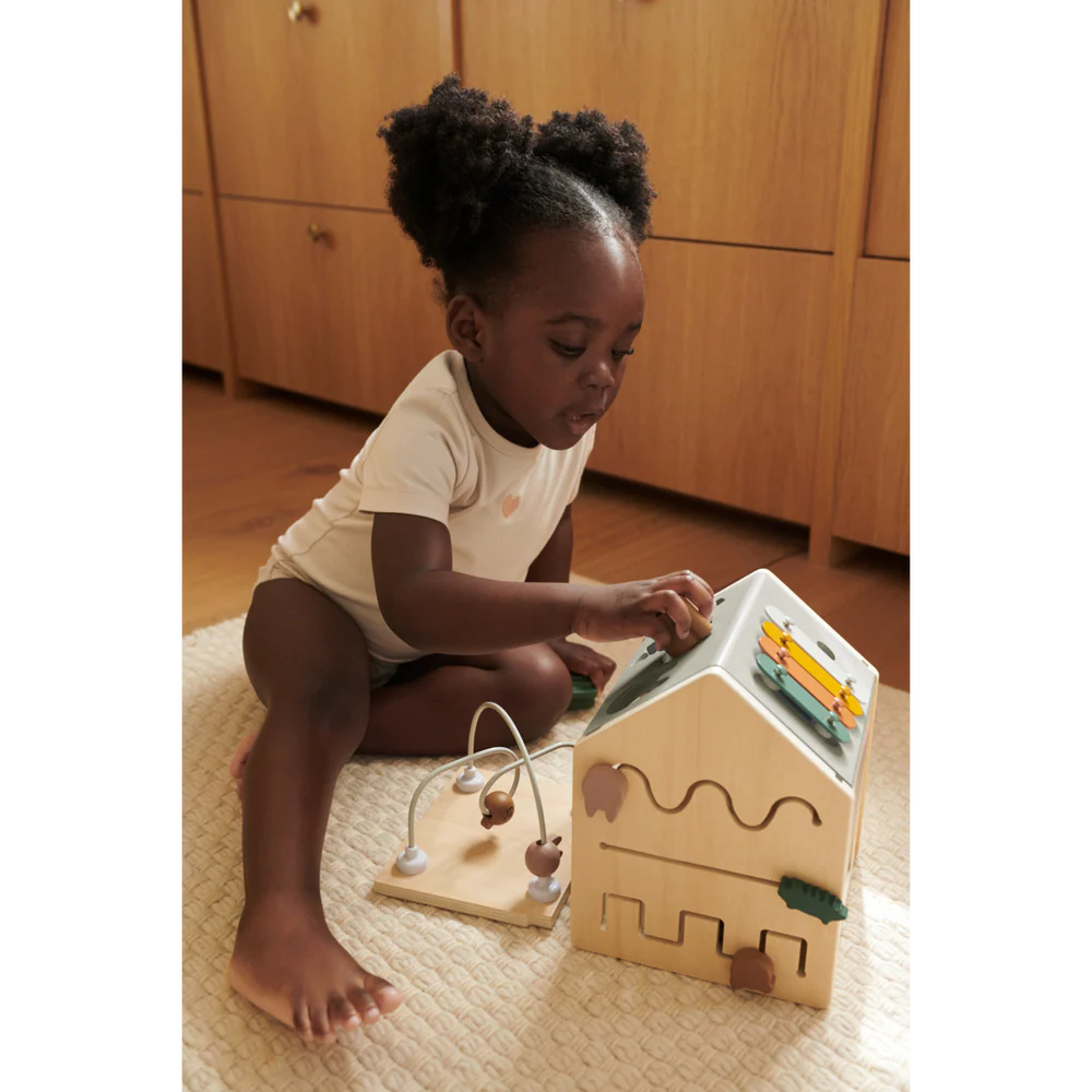 Liewood Lucas to drewniana kostka aktywizująca w kształcie małego domku, zaprojektowana z myślą o codziennej zabawie i odkrywaniu nowych funkcji. Każda strona kryje inny element, dzięki czemu zabawka angażuje dziecko na różne sposoby i zachęca do samodzielnego eksperymentowania.