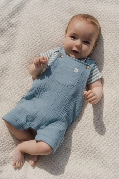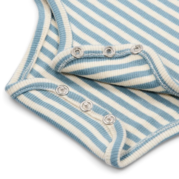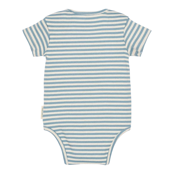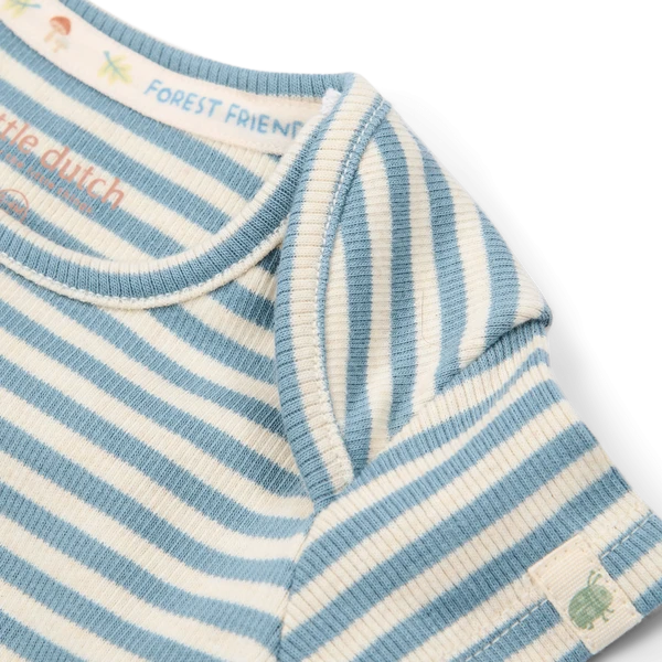 Wariant Stone Blue Stripe ma spokojny, ponadczasowy charakter, a wzór w niebieskie paski łatwo połączyć z innymi ubrankami z kolekcji Little Dutch. To wygodna baza niemowlęcej garderoby na co dzień.