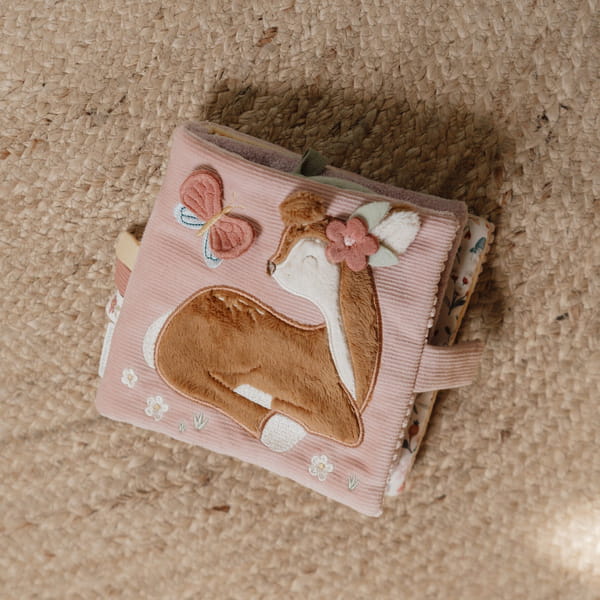 Duża książeczka sensoryczna z kolekcji Fairy Garden od Little Dutch. W środku znajdują się różnorodne faktury i miękkie materiały wspierające rozwój zmysłów oraz koordynację ręka–oko. Książeczka ma m.in. lustereczko, grzechotkę, metki i szeleściki. Wiek: 0 mc+. Wymiary: 18 x 16 x 4,5 cm.