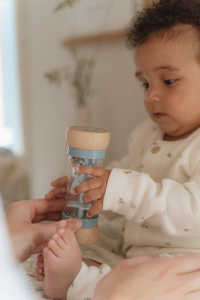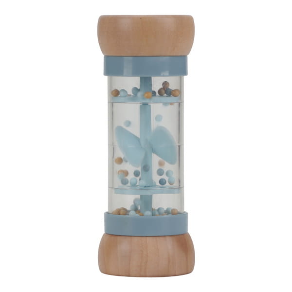 Potrząśnij i nasłuchuj! Odwróć grzechotkę i posłuchaj kojących dźwięków kuleczek przemieszczających się z jednej strony na drugą. Kuleczki spadają przez małe otwory w tubie i wprawiają śmigło w ruch, tworząc przyjemny „deszczowy” efekt.