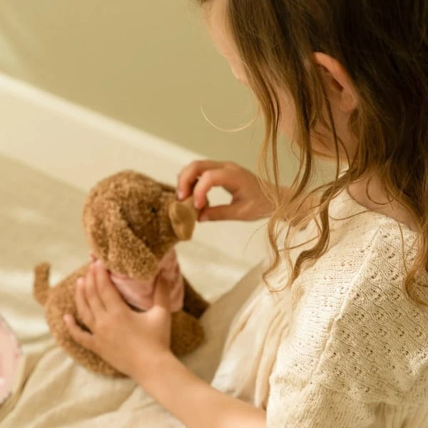 Little Dutch Jackie przytulanka pies w torbie to uroczy zestaw stworzony z myślą o dzieciach, które lubią miękkie przytulanki i zabawę w odgrywanie ról. Jackie ma miękkie futerko, różową bandamkę z imieniem i swoją ulubioną kostkę do zabawy, a całość została zapakowana w wygodną torbę z kwiatowym nadrukiem.