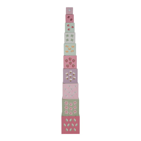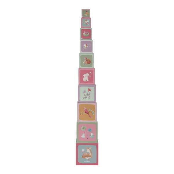 Little Dutch Kartonowa wieża Fairy Garden FSC to zestaw 10 kartonowych klocków do układania w wysoką wieżę lub poziomy „pociąg” na podłodze. Na każdej ściance klocków znajdują się urocze ilustracje z kolekcji Fairy Garden – sarenki, króliczki, jeże, biedronki oraz kwiaty.