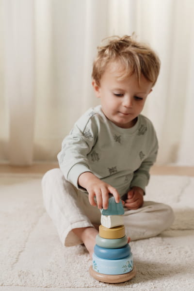 Układanie pierścieni w odpowiedniej kolejności wspiera koordynację ręka–oko, rozwój motoryki małej oraz koncentracji. Zabawka wykonana jest z drewna FSC i pomalowana bezpiecznymi farbami na bazie wody, idealna dla maluchów od około 12. miesiąca życia.
