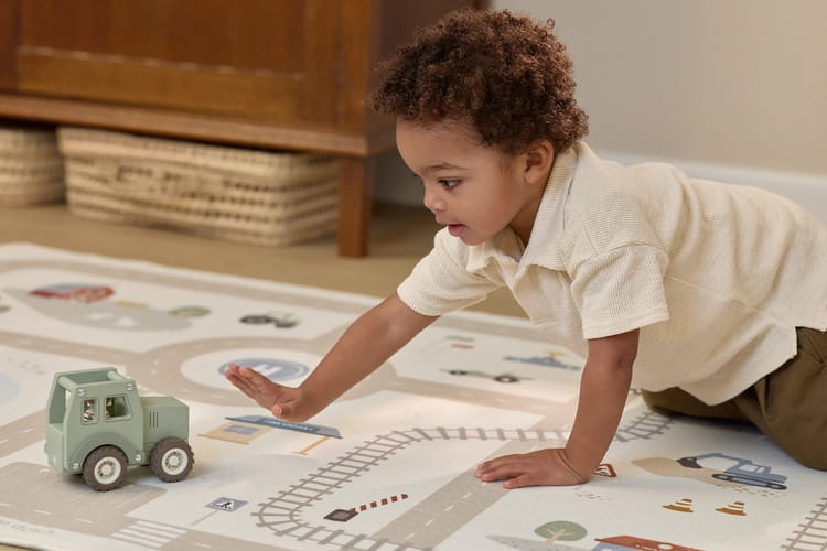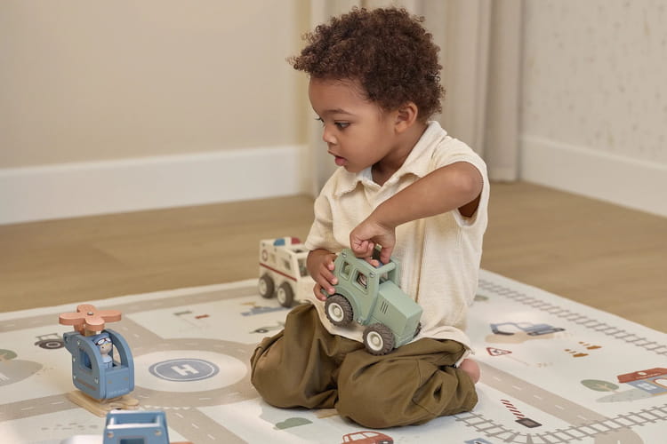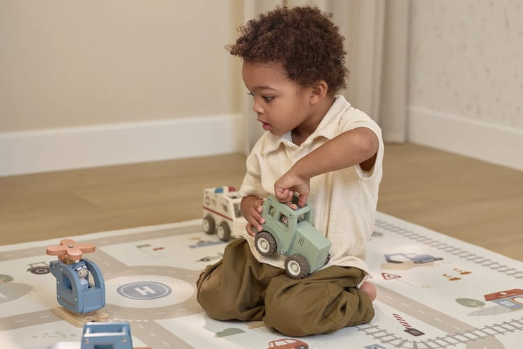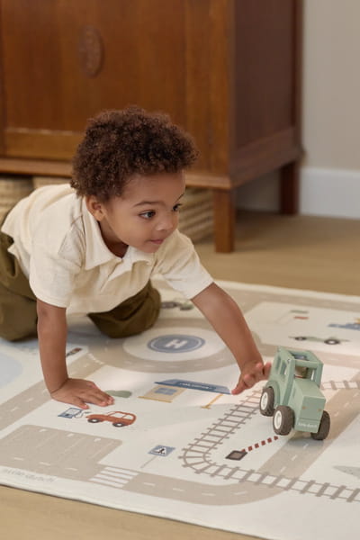 Zabawka została wykonana z drewna z certyfikatem FSC i pokryta farbami na bazie wody. To dobry wybór dla dzieci, które lubią pojazdy, zabawę na podłodze i odgrywanie prostych historyjek związanych z gospodarstwem i ruchem pojazdów.