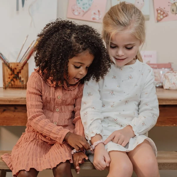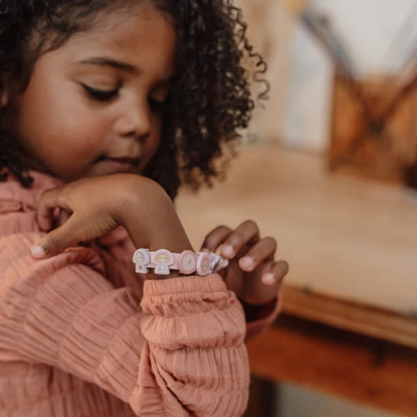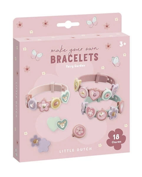 Zestaw do robienia bransoletek Little Dutch Fairy Garden to kreatywna zabawa dla dzieci 3+. W pudełku są 3 bransoletki i 18 zawieszek, które można dowolnie łączyć i zmieniać, tworząc własną biżuterię i ćwicząc motorykę małą.
