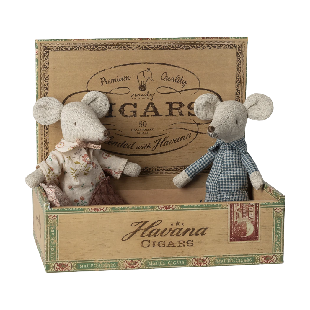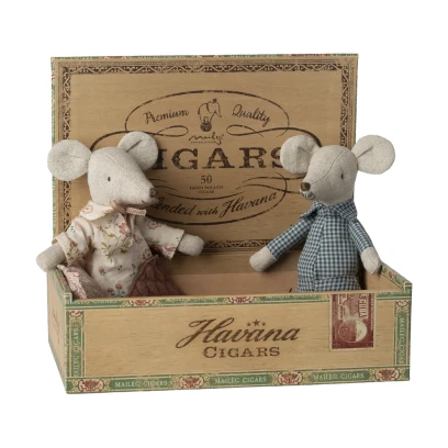 Ten zestaw Maileg ma w sobie wszystko, co kochamy w świecie myszek: dwie dopracowane postacie, piękne ubranka i pudełko, które nie jest tylko opakowaniem. Pudełko po cygarach działa jak łóżeczko, a do kompletu dostajesz pościel, więc zabawa może zacząć się od razu.