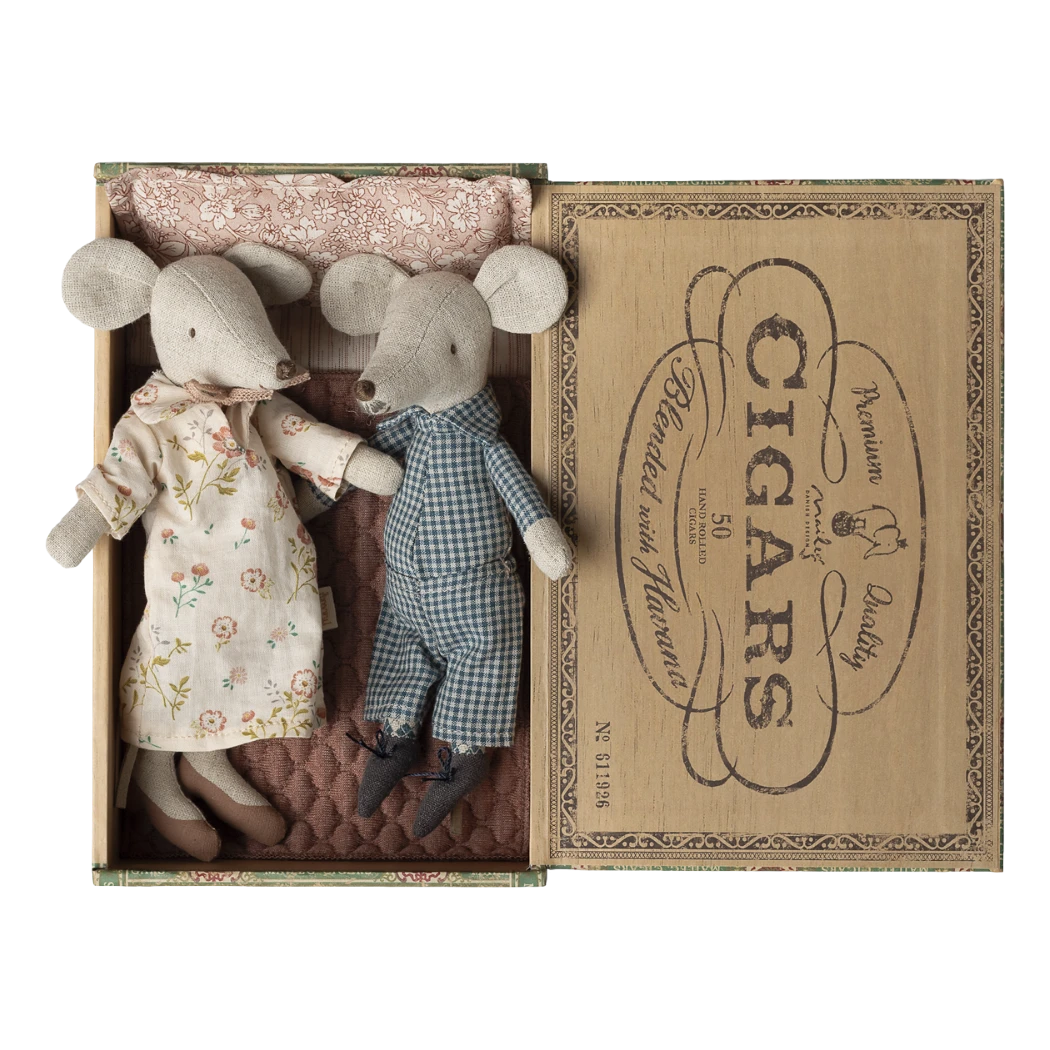 Maileg myszki Babcia i Dziadek w pudełku po cygarach 17 cm