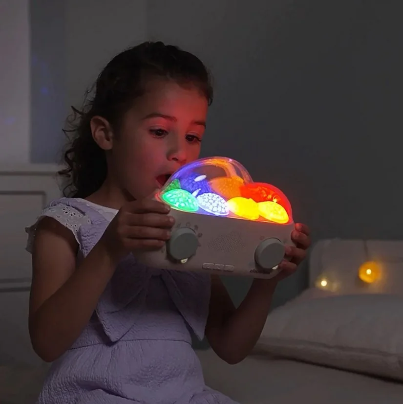 CloudBox to pierwszy projektor opowiadający bajki, który łączy światło, dźwięk i narrację. Niewielkie urządzenie zamienia pokój dziecka w magiczną scenę – na ścianie pojawiają się kolorowe projekcje, a maluch słucha spokojnych historii po polsku i po angielsku.