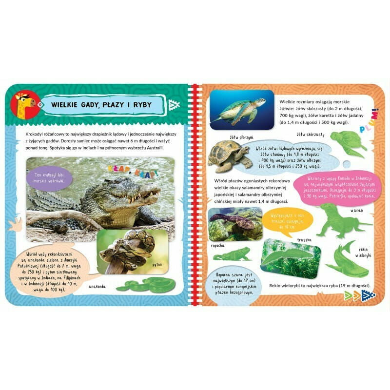 Odkryj rekordzistów świata przyrody: najszybsze, największe i najbardziej niezwykłe gatunki. Książeczka łączy barwne zdjęcia z krótkimi ciekawostkami i arkuszem naklejek, z których dziecko tworzy własny mini-atlas.