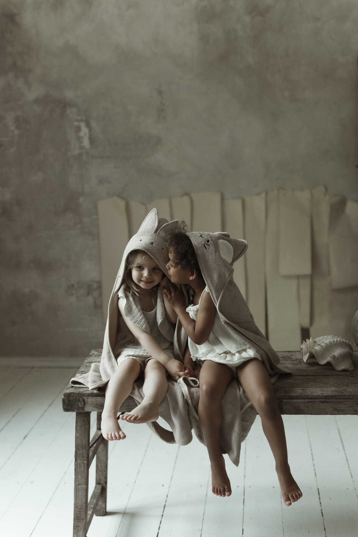 Bambusowy ręcznik Beige Rabbit My Memi to delikatny i chłonny ręcznik z kapturkiem, wykonany z naturalnej tkaniny bambusowej z dodatkiem bawełny. Miękki, bezpieczny i przyjazny dla skóry dziecka – idealny po każdej kąpieli.