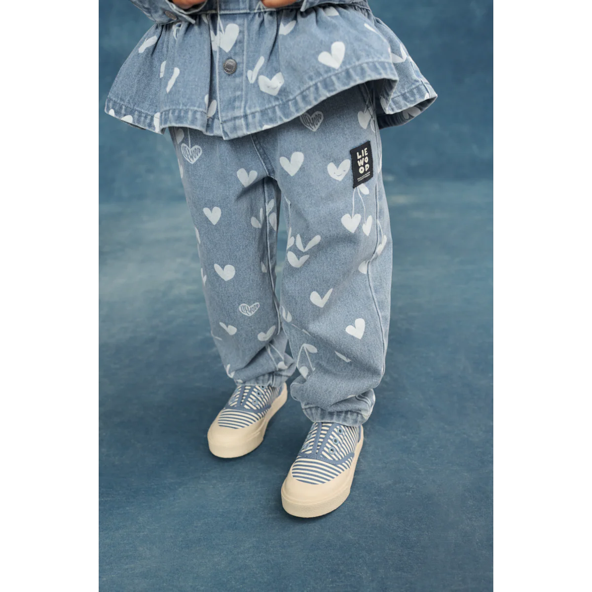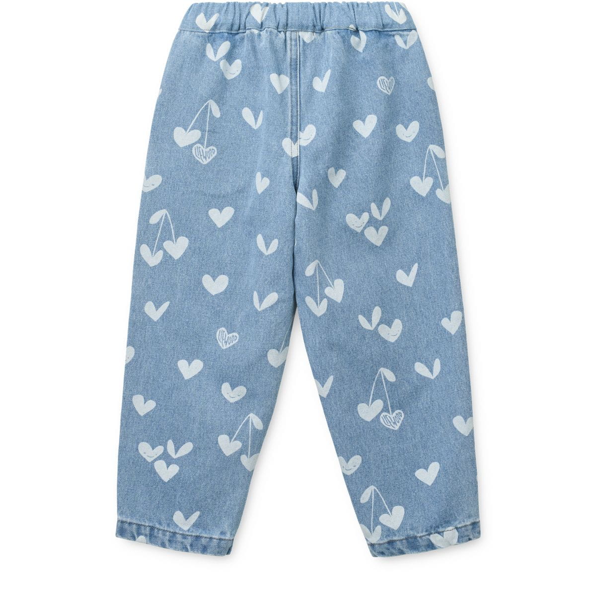 Dziecięce jeansowe spodnie Liewood Borris Printed Denim Trousers z nadrukiem Sweethearts w kolorze Light Blue Denim. Wygodne i trwałe jeansy idealne na co dzień i do stylizacji casual.