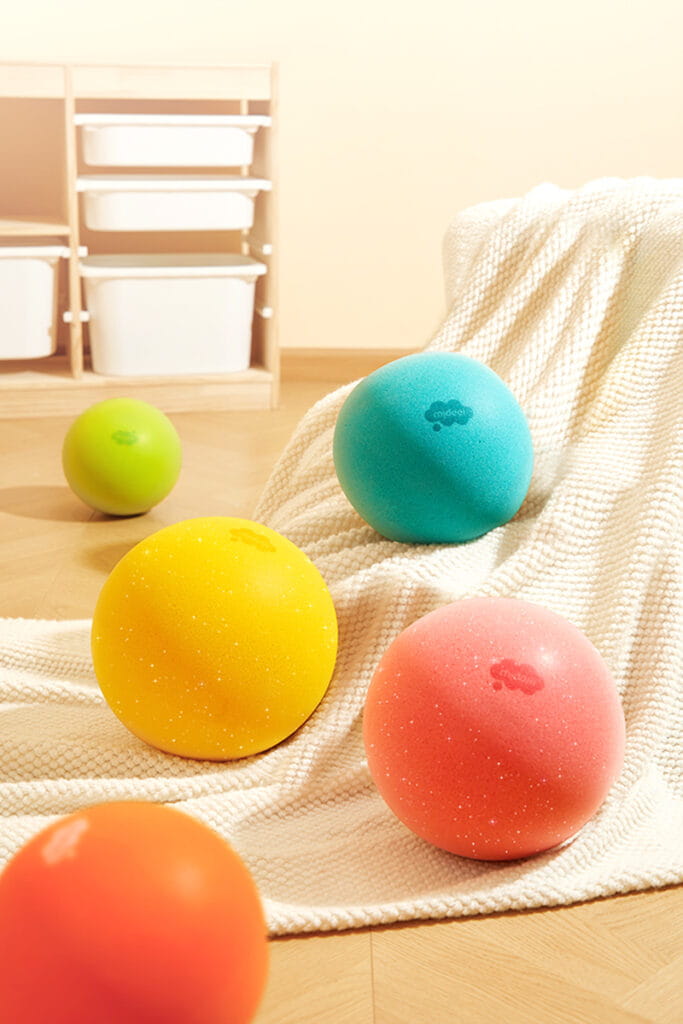 - Zachęca do aktywności – rzucanie, turlanie, podrzucanie, przekładanie z ręki do ręki,