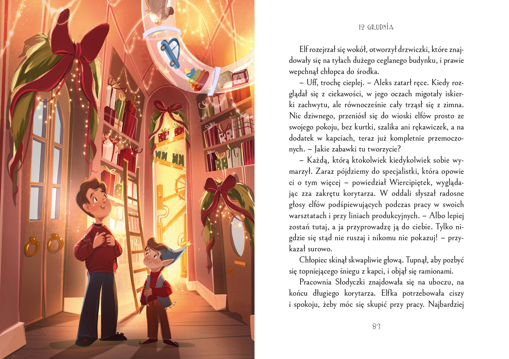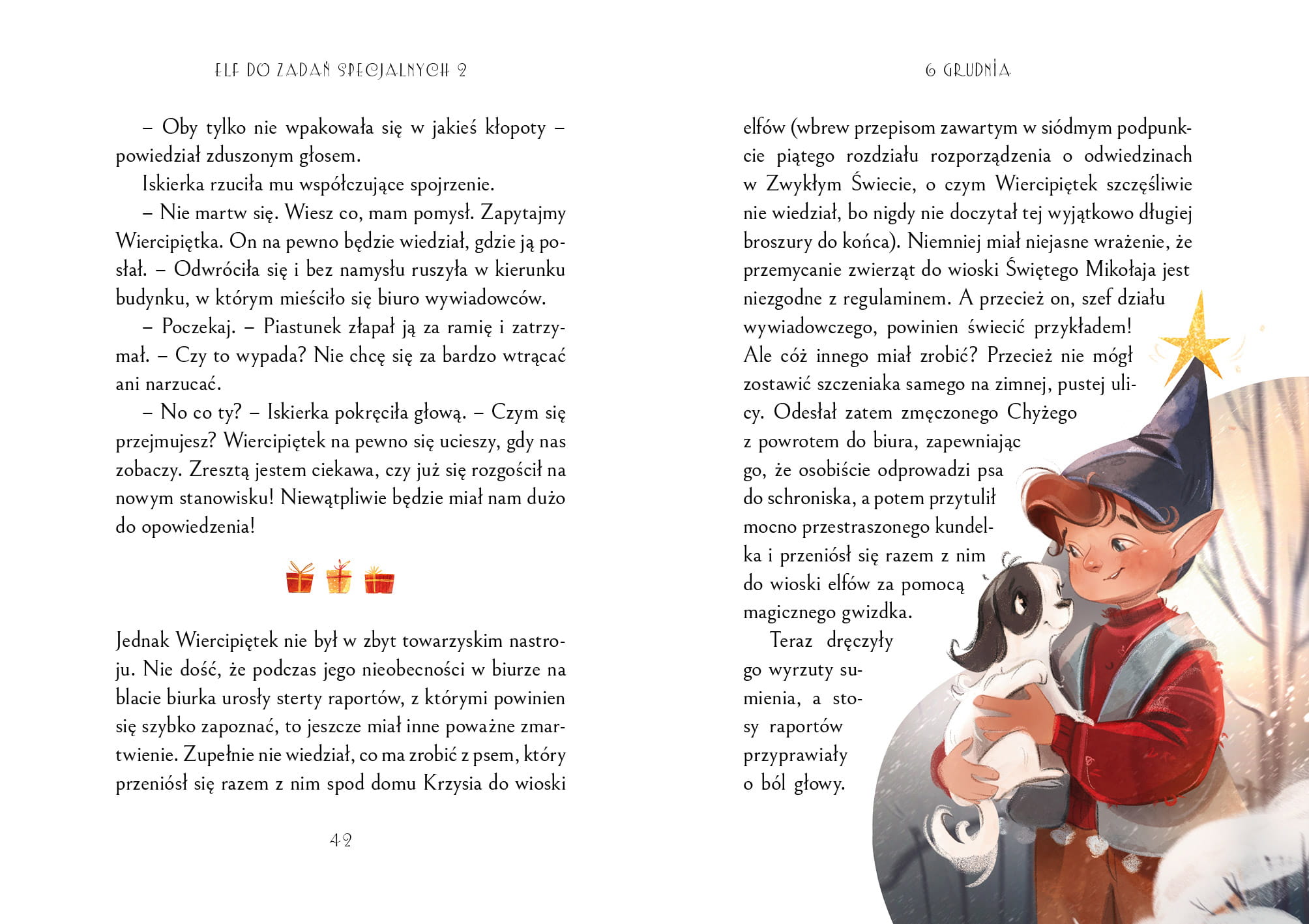 Wszystko zmienia się, gdy pojawia się niezwykle ważna misja: trzeba odnaleźć szczeniaka pewnego chłopca oraz sprowadzić z powrotem do wioski elfkę, która zagubiła się w świecie ludzi. Wiercipiętek wyrusza w drogę, a wraz z nim czytelnik – przez kolejne zimowe dni, pełne emocji, zwrotów akcji i ciepłego humoru.