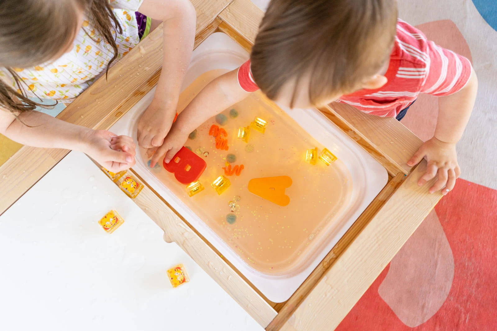 - butelki i słoiki sensoryczne – kostkę można włożyć do słoika z wodą, brokatem czy koralikami, tworząc świecącą „lampkę” do namiotu lub bazy,