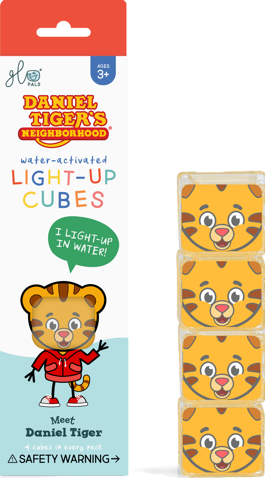 Glo Pals Daniel Tygrysek to limitowana edycja 4 świecących kostek sensorycznych, inspirowana bajką „Tygrysek Daniel i jego sąsiedzi”. Po zanurzeniu w wodzie kostki aktywują się i świecą głębokim, złotym światłem, nawiązującym do koloru futerka sympatycznego tygryska. Kąpiel zamienia się w ciepłą, przyjazną i pełną przygód zabawę.