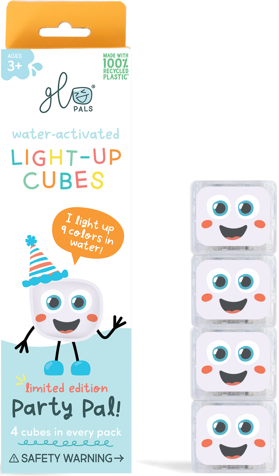 Zestaw 4 kostek Glo Pals Party Pal zamieni zwykłą kąpiel w prawdziwą imprezę kolorów. Kostki aktywują się dopiero po zanurzeniu w wodzie, a po wyjęciu i osuszeniu automatycznie gasną. Party Pal to wersja wielokolorowa – kostki nie świecą na biało, tylko zmieniają barwy, tworząc efekt tęczowego, podwodnego światła.