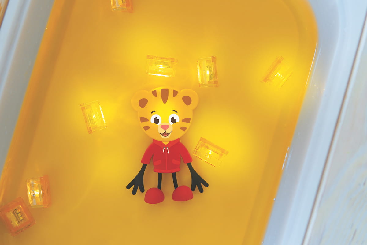 Tygrysek Daniel z kultowej bajki „Tygrysek Daniel i jego sąsiedzi” trafia prosto do wanny. W zestawie znajdziesz 1 postać do kąpieli oraz 2 świecące w wodzie kostki sensoryczne w tym samym, złotym kolorze. Po zanurzeniu w wodzie kostki rozświetlają kąpiel ciepłym światłem, a Daniel staje się wesołym przewodnikiem po świecie wodnych przygód.