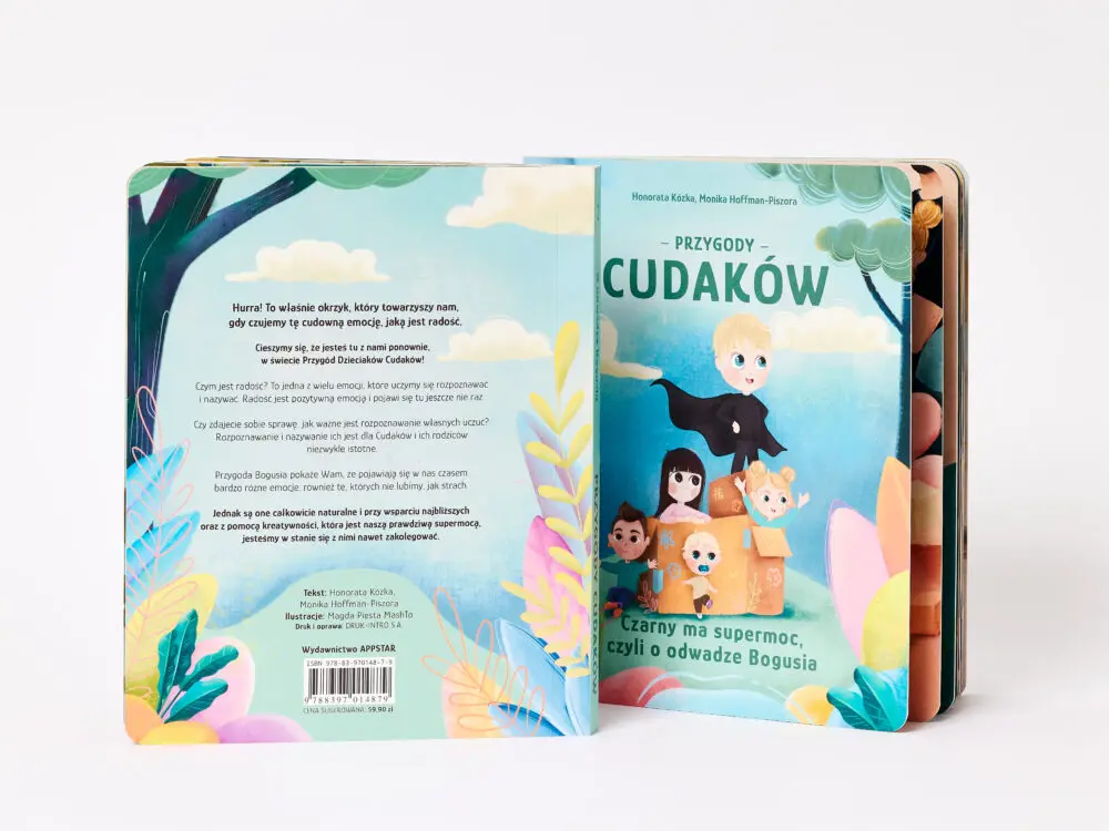 „Czarny ma supermoc, czyli o odwadze Bogusia” – Przygody Cudaków, Tom II to opowieść o strachu, odwadze i o tym, że każdy z nas ma w sobie supermoc. Książeczka w prosty sposób pokazuje dziecku, że bać się jest normalnie, a wsparcie bliskich i własna kreatywność pomagają ten strach oswoić.
