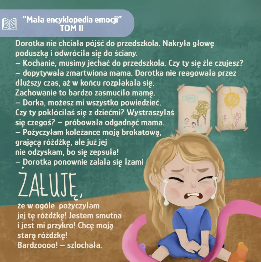 Mała encyklopedia emocji – Tom II to zestaw nowych, krótkich historii o uczuciach, które pomagają dzieciom nazwać to, co dzieje się w środku, i poradzić sobie z trudniejszymi chwilami. Delikatne ilustracje i prosty język zachęcają do rozmów i wspólnego oswajania emocji na co dzień.