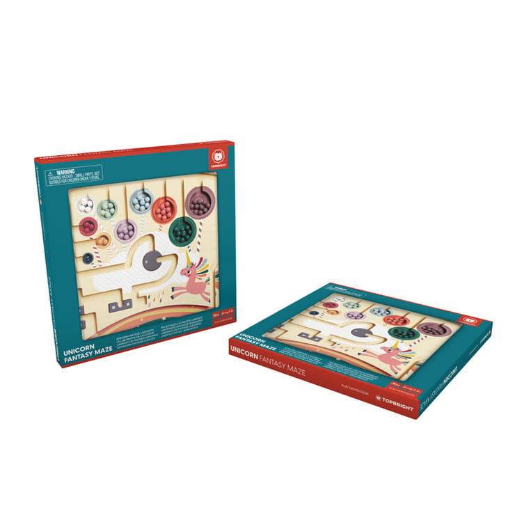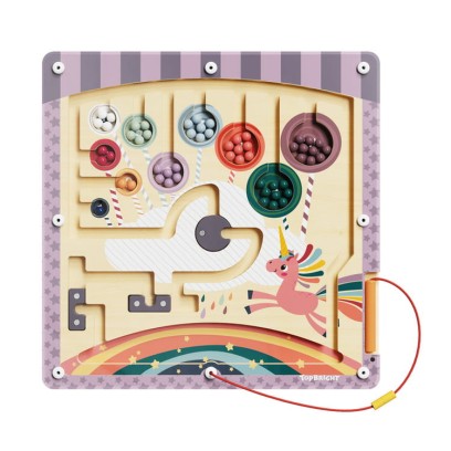 Fantastyczny jednorożec – magnetyczny labirynt Topbright. Dziecko prowadzi kolorowe kulki rysikiem z magnesem, trenując motorykę małą, kolory i koncentrację. 36 m+.