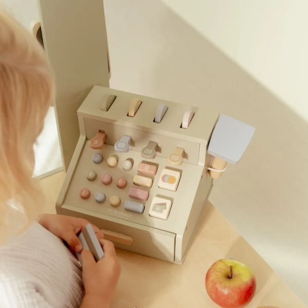 Little Dutch Drewniana kasa FSC doskonale łączy się z innymi zabawkami do odgrywania ról – takimi jak waga kuchenna, zestawy produktów spożywczych, koszyki na zakupy czy mini–sklepy. Wystarczy kilka elementów, aby stworzyć pełny kącik sklepowy w domu lub w pokoju dziecka.