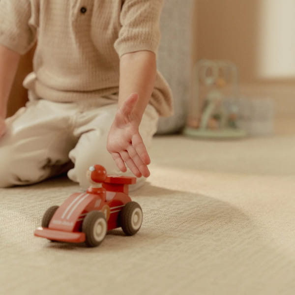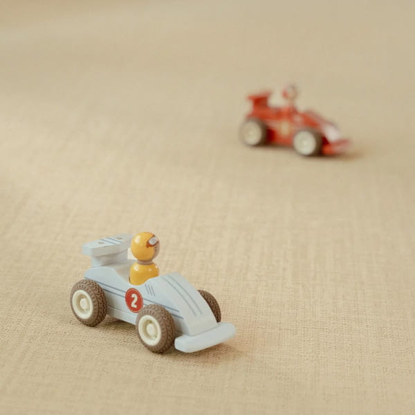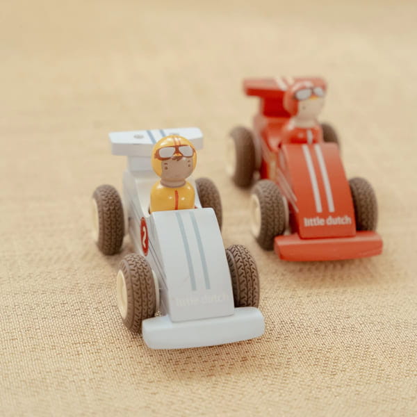 Na miejsca, gotowi… start! Drewniane samochody wyścigowe Little Dutch to zestaw, który natychmiast zamienia podłogę w tor wyścigowy. W komplecie znajdują się dwa autka – czerwone i niebieskie – oraz dwie figurki kierowców, które można dowolnie przekładać między pojazdami.