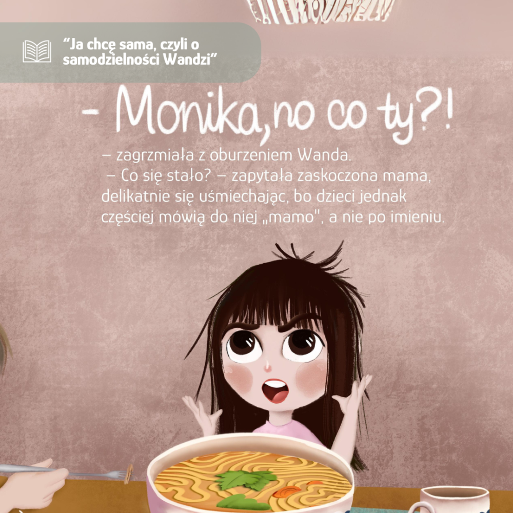 Mała Wandzia, wielkie ambicje. Pewnego dnia postanawia, że teraz wszystko będzie robić sama – szczególnie przy jedzeniu. Zamiast spokojnego karmienia zaczyna się przygoda pełna rosołu, łyżek, plam i wielkich emocji.