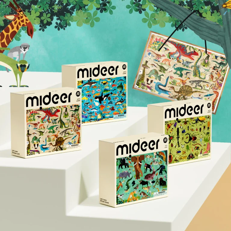 Edukacyjne puzzle Mideer z serii „Uczmy się!”. 126 dużych elementów, broszura z ciekawostkami i rozmiar po ułożeniu 59,5 × 40 cm. Idealne dla dzieci 3+, rozwijają spostrzegawczość i koncentrację.