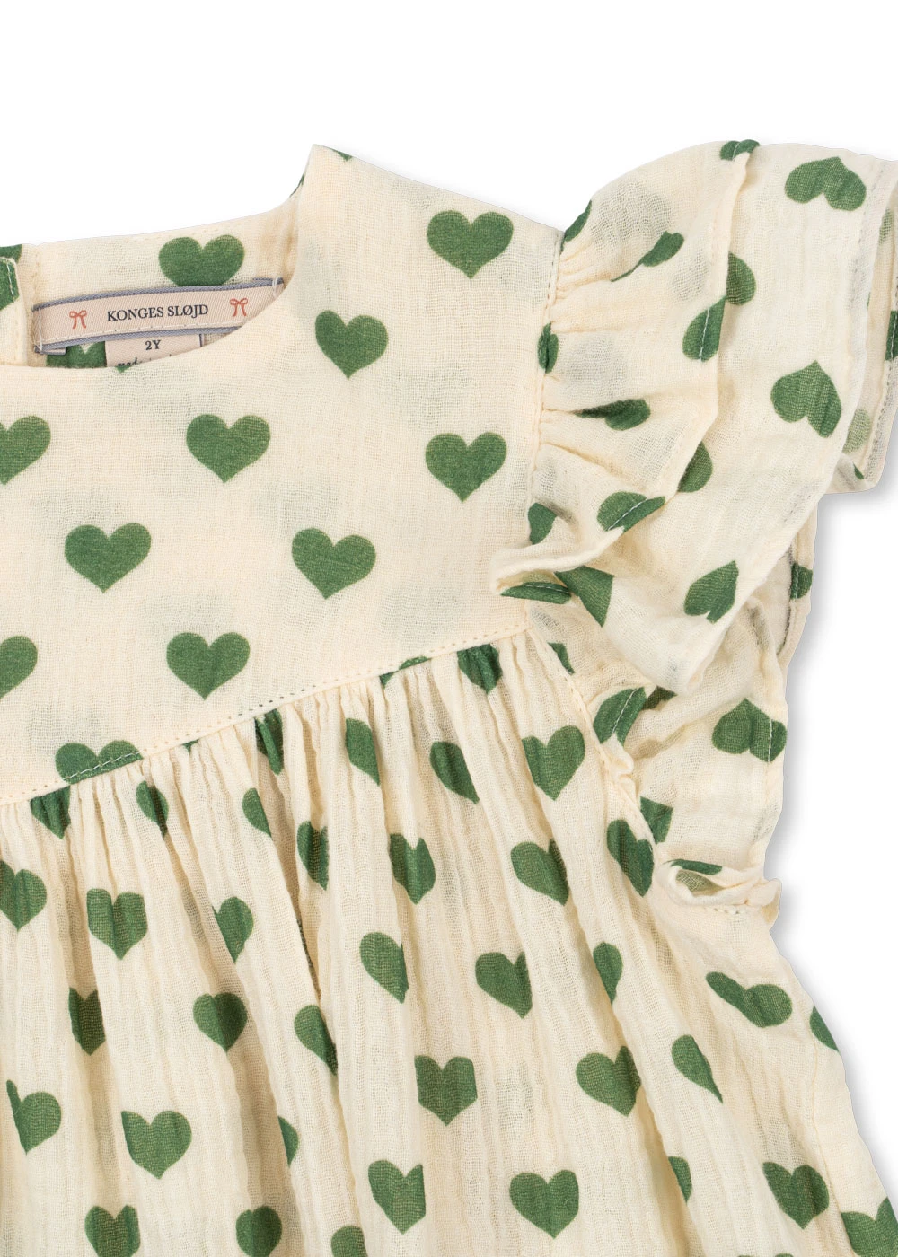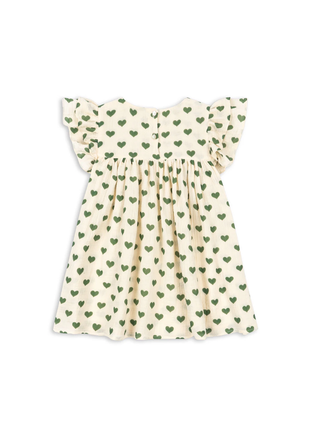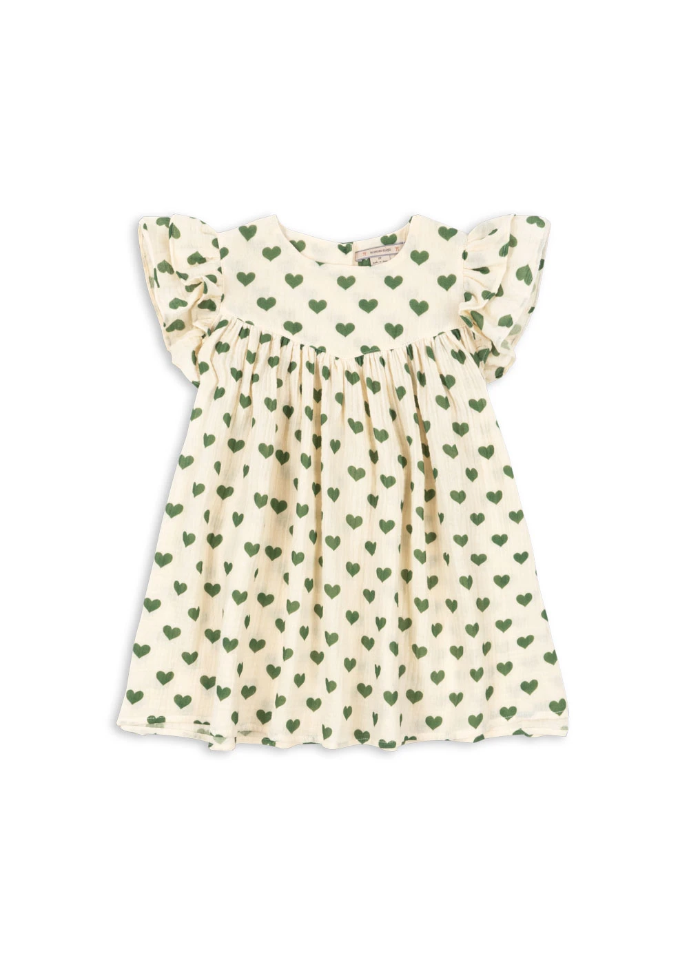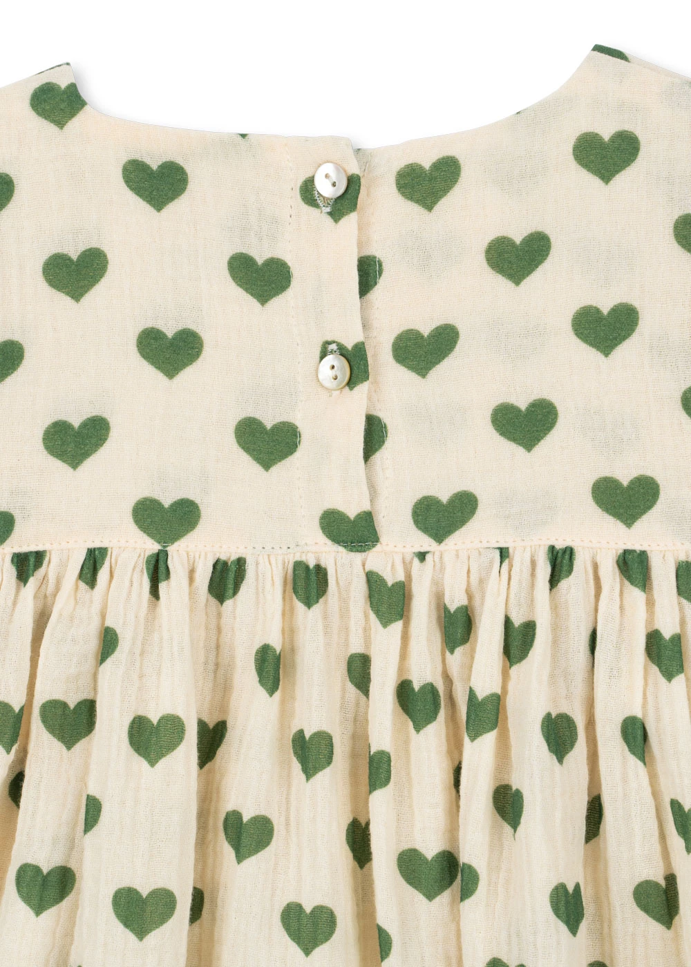 Sukienka Coco w zielone serduszka to lekki model z oddychającej bawełny muślinowej. Ma swobodny fason i delikatny print, który pięknie wpisuje się w letnią garderobę.