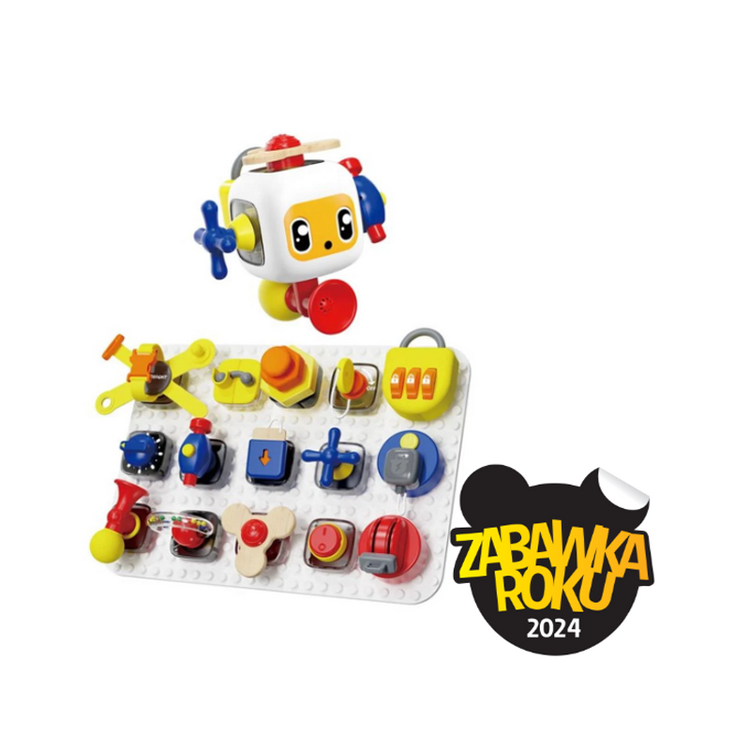Z tablicą manipulacyjną od Topbright maluchy wyruszą w podróż edukacyjną. Zestaw składa się z kostki, tablicy z wypustkami i 15 doczepianymi elementami. Dzięki przemyślanej konstrukcji ruchome części można złączyć z kostką lub tablicą. Dziecko ma do dyspozycji przyciski, pokrętła, głośny klakson, przełącznik czy kluczyk do przekręcania. Każdy z elementów zabawki ma zastosowanie w życiu codziennym osób dorosłych.